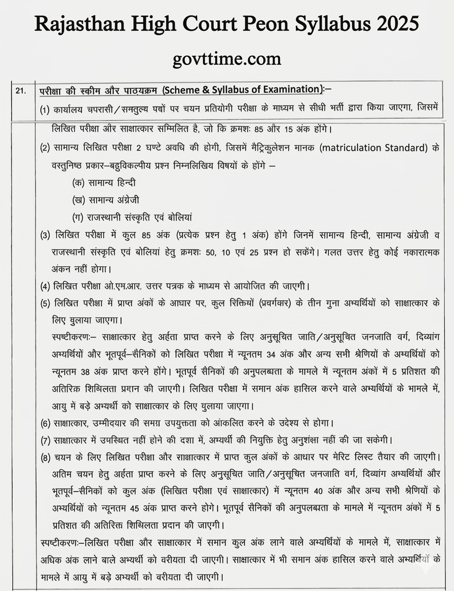 Rajasthan High Court Peon Syllabus 2026 के तहत लिखित परीक्षा 85 अंकों की होगी। परीक्षा का स्तर 10वीं (Matriculation) कक्षा का रहेगा।